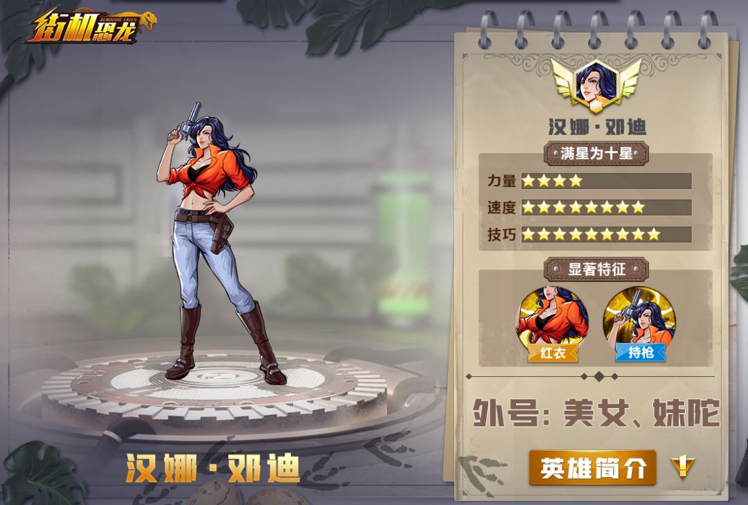 汉娜·邓迪,玩家又称其为“美女”、“妹陀”、“红衣女”等,在漫画原作《恐龙新世界》中是女主角,和男主角杰克是一对情侣。《街机恐龙》手游中,汉娜仍红衣长腿,秉持人与恐龙和平共处的初心,与天灾博士为代表的邪恶势力斗争到底。