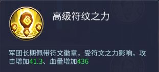 高级符文之力:军团长期佩戴符文徽章,受符文之力影响,攻击增加41.3,血量增加436