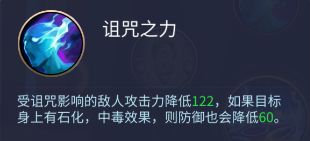 诅咒之力:受诅咒影响的敌人攻击力降低122,如果目标身上有石化,中毒效果,则防御也会降低60。