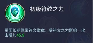 初级符文之力:军团长期佩戴符文徽章,受符文之力影响,攻击增加45.9