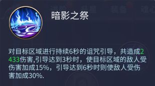 暗影之祭:对目标区域进行持续6秒的诅咒引导,共造成2433伤害,引导达到3秒时,使目标区域的敌人受伤害加成15%,引导达到6秒时则使敌人受伤害加成30%。