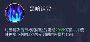 黑暗诅咒:对当前攻击目标施加诅咒造成2949伤害,并使其在接下来的5秒内受到的伤害增加15%。