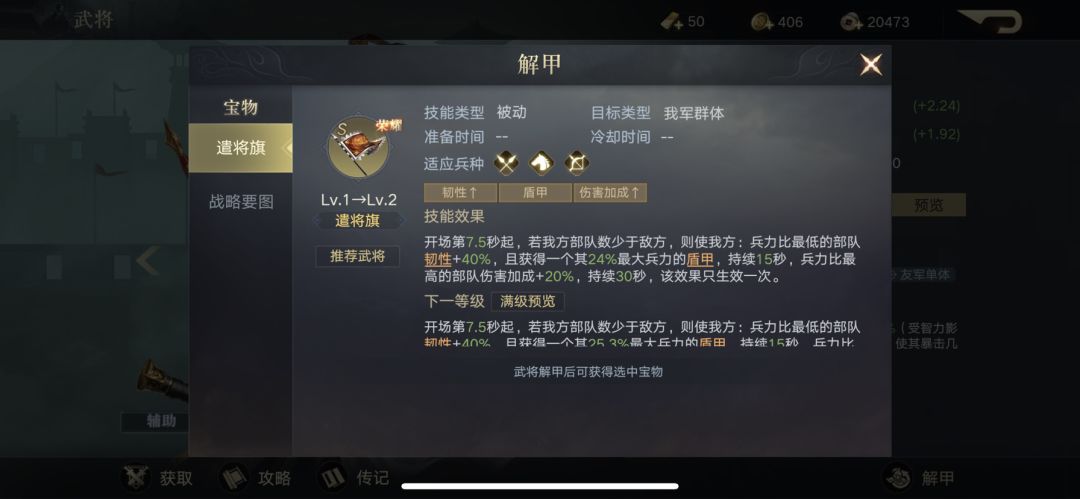 遣将旗:开场第7.5秒起,若我方部队兵力少于敌方,则使我方兵力最低的部队韧性增加40%(韧性是降低产生暴击率),且获得一个36%的护盾(抵挡伤害),我方兵力最高的部队伤害加成增加40%,也就是说7.5秒后只要有一支部队兵力少于敌方,则可以发动该宝物效果,最低与最高兵力的我方部队属性都可以提升。