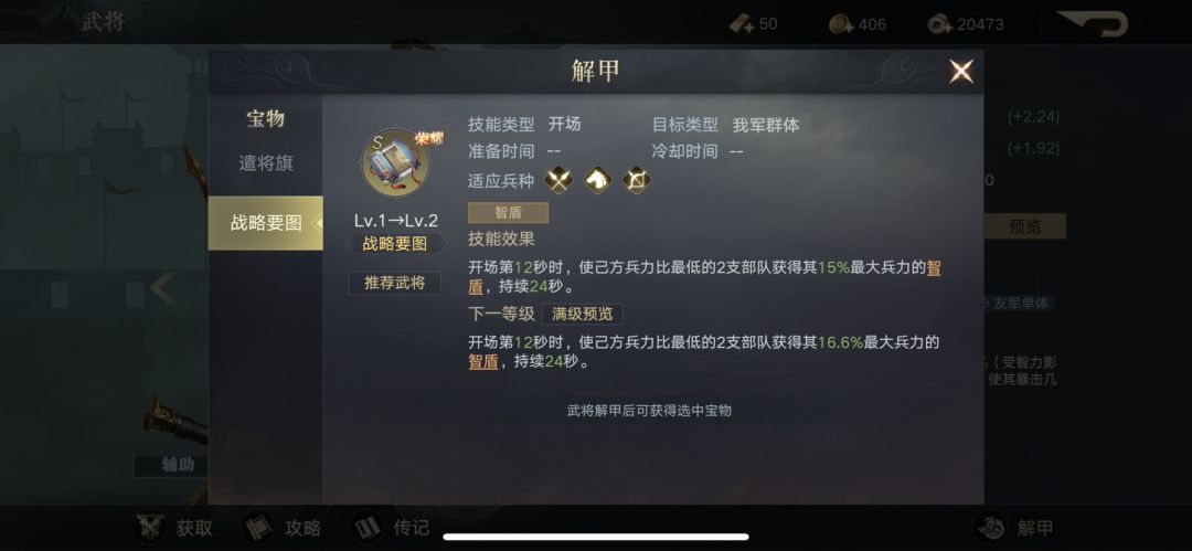 战略要图:开场第12秒时,使我方兵力最低的2支部队获得一个其自身15%最大兵力的智盾(抵挡智力伤害)。相对遣将旗来说战略要图的性价比较低,智盾只能抵挡智力伤害,也没有其他的增加,所以建议首选拆遣将旗。