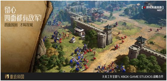 《重返帝国》更在游戏中模拟了城池攻防战,这也是游戏最重磅的玩法创新之一。在《重返帝国》中,城池不再是简单的“点”,而是立体且真实的“城”。游戏参考了古代城池布局,加入了“城门”的概念,并为每座城池设计了东西南北4个城门。这种多城门式的城池设计,使得进攻点和部队调遣成为玩家新的策略抉择点。经典攻城战中采用的多城门进攻战术,将有机会在游戏中再现。