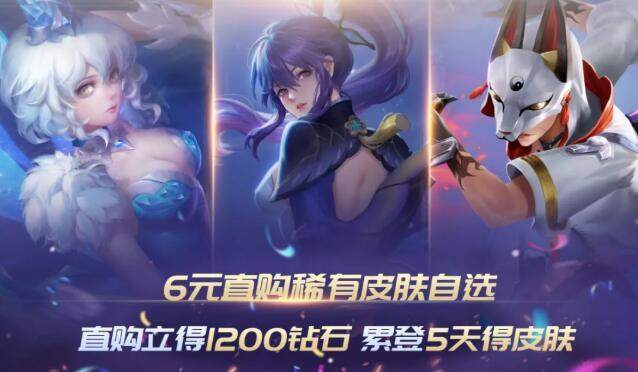 11月24日-11月30日,6元可直购1个稀有皮肤自选礼包(包含蝶恋花·扶摇、狐不语·鱼阴、冰雪精灵·C9);直购立得1200钻石,每日登录可领2合金,累登5天领稀有皮肤自选礼包。