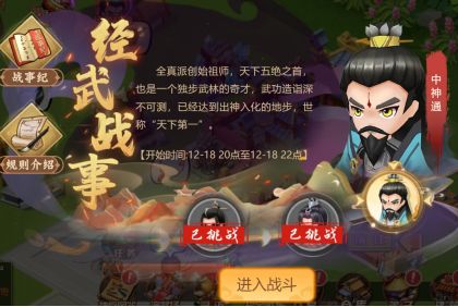 ①经武战事以每周三位首领前来挑战开启战场,每周二、周四、周六晚8点至10点为活动挑战时间,届时,各位掌门可通过首页的活动图标进入挑战页面;
