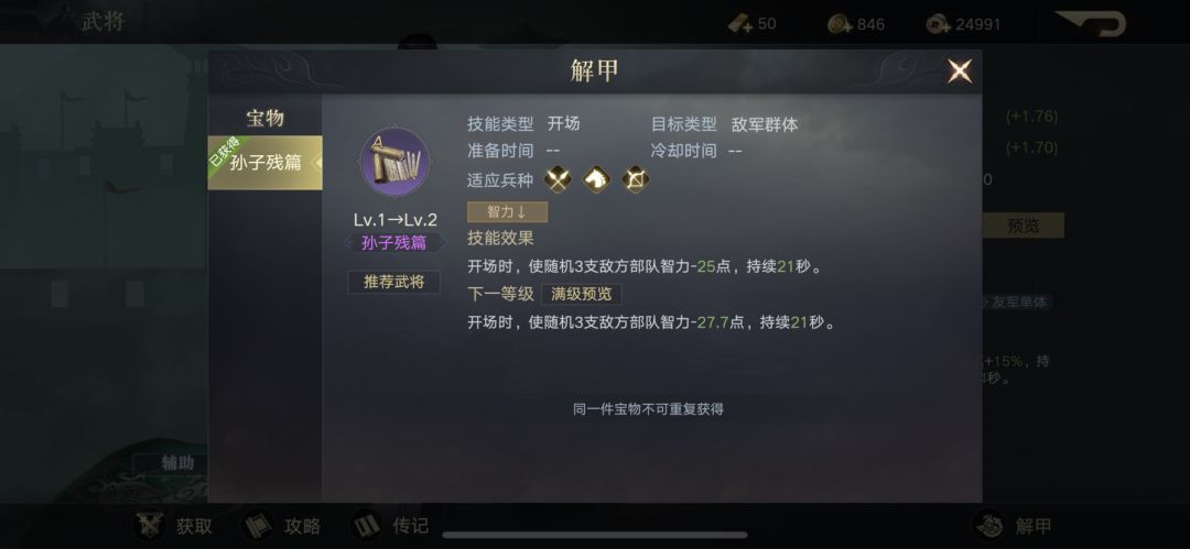 马谡可以拆解孙子残页,该宝物是个开场技,使随机敌方3支部队的智力降低50点,如果敌方有智力输出型武将也是个很不错的选择。