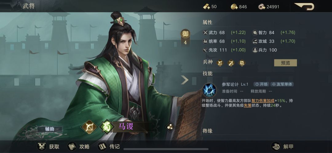 马谡是蜀国紫色四御弓兵武将,其自身的技能是一个开场技,使智力最高的我方部队智力伤害加成+30%,并且可以免疫失策24秒,是个跟智力输出武将很好的搭配。