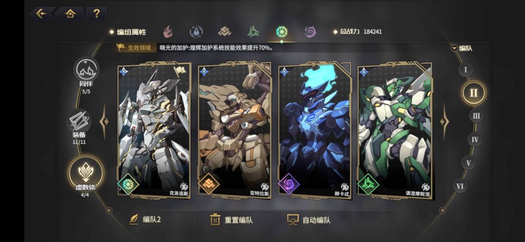 回响多人光机甲,工坊造,余音换辉煌伽玛2型。机甲一号位克罗洛斯,二号位后面白送的加属性攻击力的光机甲。三号位暗属性机甲(因为它有稀有的去除buff技能)。四号位看情况(记住风加闪避,地加防御)。