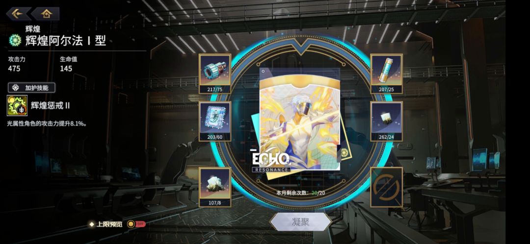 初级阶段,机甲克罗洛斯放一号位(对非重氪玩家来说克罗洛斯很强,建议强满。没有氪金回响套,阿波罗也只能添头,至于后面签到送的。建议别用)。回响使用辉煌阿尔法1型为主力,上八个,强化到30级,然后挂件两个辉煌伽玛1型