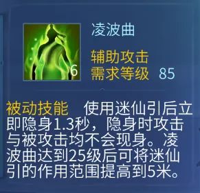 巧用第三个天赋凌波曲与技能疏影,做到无限隐身。当疏影快结束时,使用迷仙引,然后接风归云+疏影 。注意在凌波曲隐身状态时攻击与被攻击均不会现身,所以魅者在迷仙引期间可以丢技能风归云而不会现身。