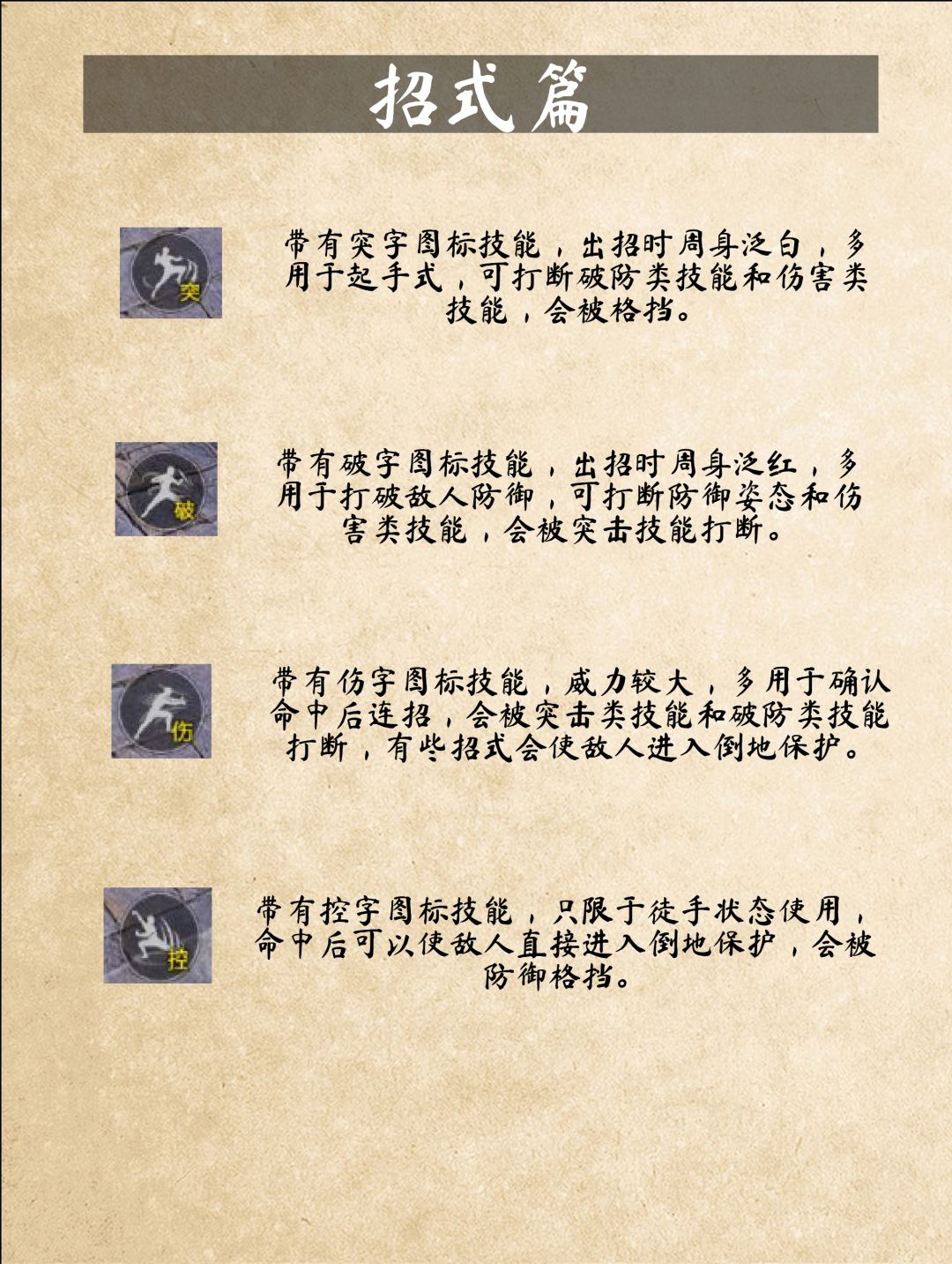 武侠乂内突击招式克制破防招式和伤害招式,破防招式克制格挡状态和伤害招式,格挡状态防御突击招式和伤害招式,控制招式无法对格挡状态起作用。