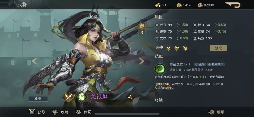 关银屏是蜀国三御紫色的枪兵型武将(S1赛季尾端出了其橙卡版),其自身技能为灵蛟盘躯,对当前目标发动武力攻击(伤害率150%—300%,受武力影响) ,【附加效果】若武力高于目标,则自身获得—个2%—4%最大兵力的护盾。可以看出该技能是一个在紫将武力输出数值比较高的伤害率,而且其附带的效果还可以为自身获得一个兵力护盾,是个既能输出又能增加肉度的技能,