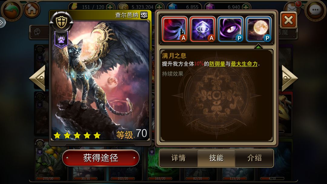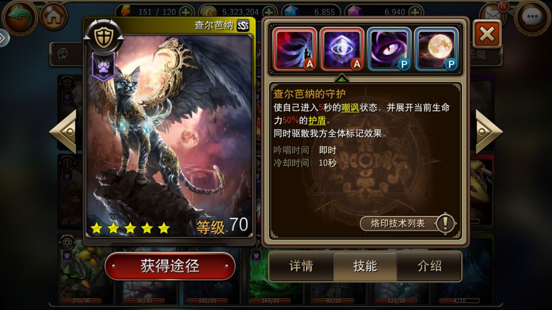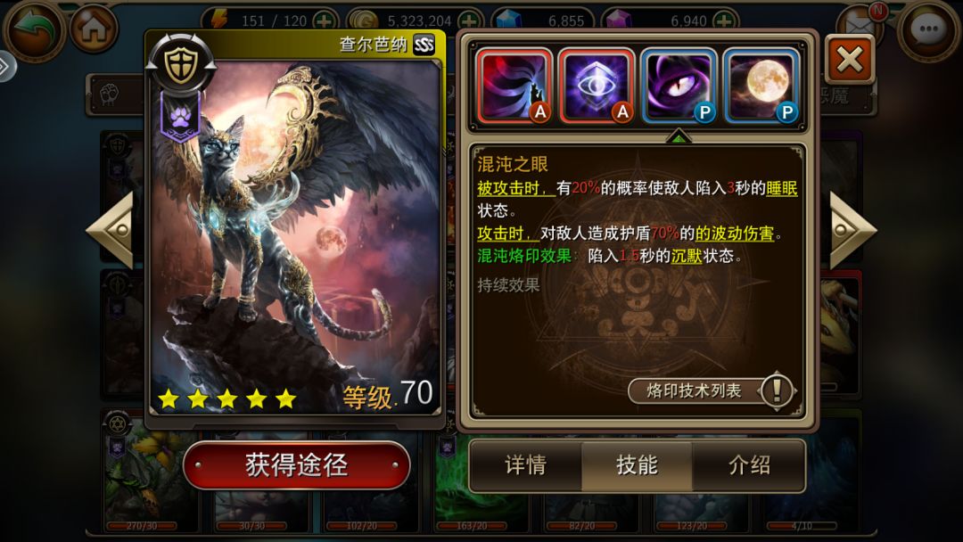 技能分析:一技能可以对目标造成吸血伤害(回复100%对敌人造成的伤害值)并为自身提供最大生命值50%的护盾,这个技能为猫坦提供非常高的坦度和生存能力,缺点是高达16s的CD且护盾可以被驱散。二技能开启嘲讽,为自己增加50%当前生命值的护盾,并且清除队友身上的标记效果,这个技能搭配一技能使猫成为了一道无法逾越的墙,只要敌方没有驱散技能,猫可以帮队友吸收成吨的伤害,经常对面全都死了猫的护盾还没有破。三技能使猫可以造成波动伤害(对敌方造成自身护盾值的伤害)并可以触发混沌烙印的沉默效果,被攻击时还有几率使攻击者进入睡眠状态,进可攻退可守。四技能加全体防御和最大生命,能给全队提升一些坦度,使队友推图时更不容易死亡。 ③个人评价: 输出能力:单体3星,无群伤能力,攻击面板较低,攻速中等。 抗伤能力:5星,自身较高的生命与防御成长嘲讽 加100%生命值的护盾,敌人盾都打不 破,血量及防御面板高,特别能抗。