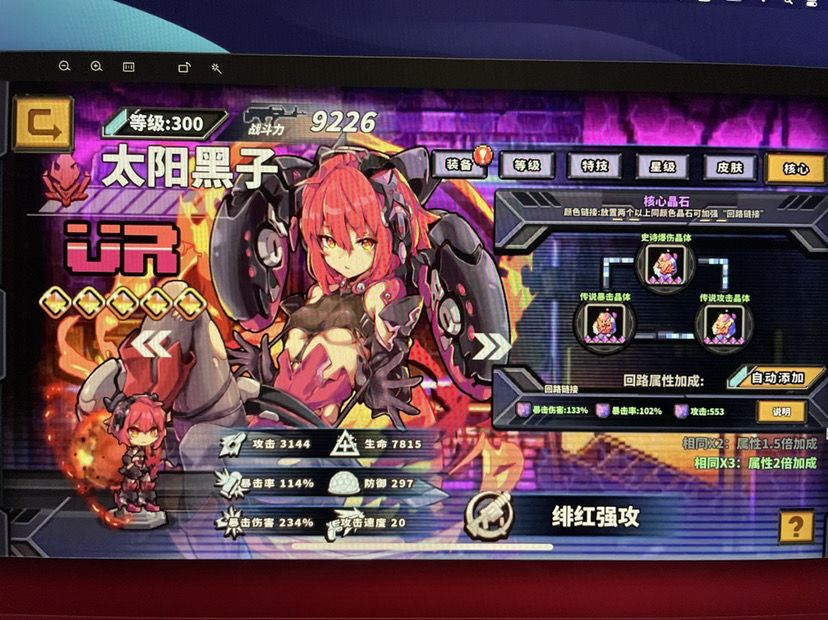 整个游戏能拉开差距的就是核心晶石了,之前还不太懂现在我也就刚明白一点,对于数据极限还不知道怎么个算法,尽量保证暴击在100左右,攻击一个暴伤一个,有些追求极限数据的大佬,靠支援加上几个特技加成一攻击双暴伤,以后有机会我试试看测数据哈。极品石头应该还是靠运气的,到现在因为不怎么刷石头,还没找到极限数据的石头。(以后单开一个找极限数据石头帖子。)