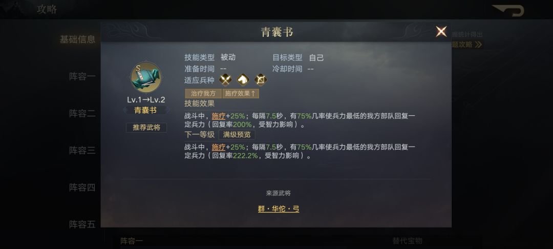 刘备的属性培养主走智力,加点优先智力。在宝物使用上,可以携带青囊书或者屯田令,增加兵力回复效果。