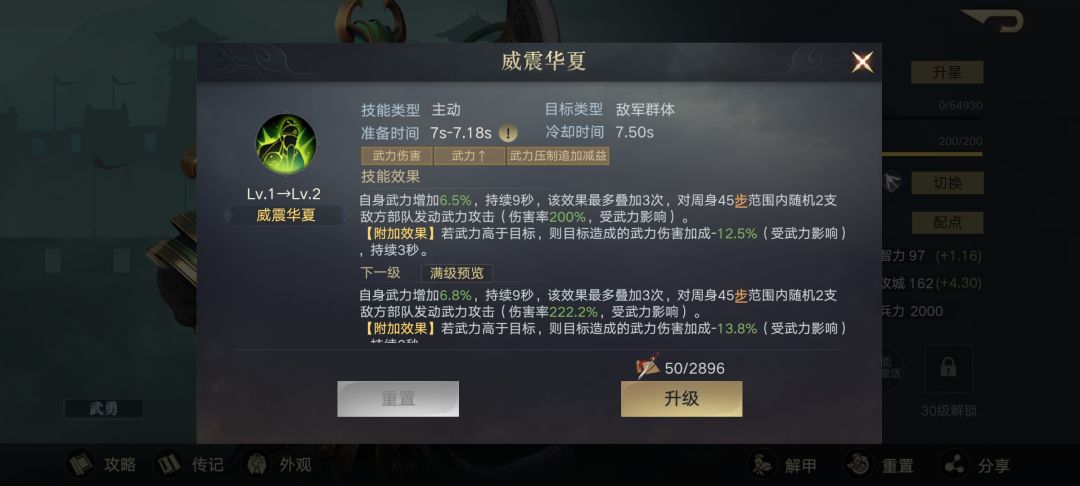 其技能威震华夏,能够对附近范围内2支队伍发动武力攻击,并且让自身受到来自骑兵的伤害减少15%。而且该技能还有附加效果——武力高于目标时回自身一定的兵力。不愧是皇叔的好兄弟,大家的技能都有附加效果。作为枪兵的关羽,本就克制骑兵,竟然还能减伤骑兵的伤害,四骑阵容遇到关羽可就不好受了。总的来看关羽的技能也比较全面,增伤、减伤、兵力回复于一身,这样全能的输出型武将我第二赛季才出。最好可以出个满红。再带两个本命武器。