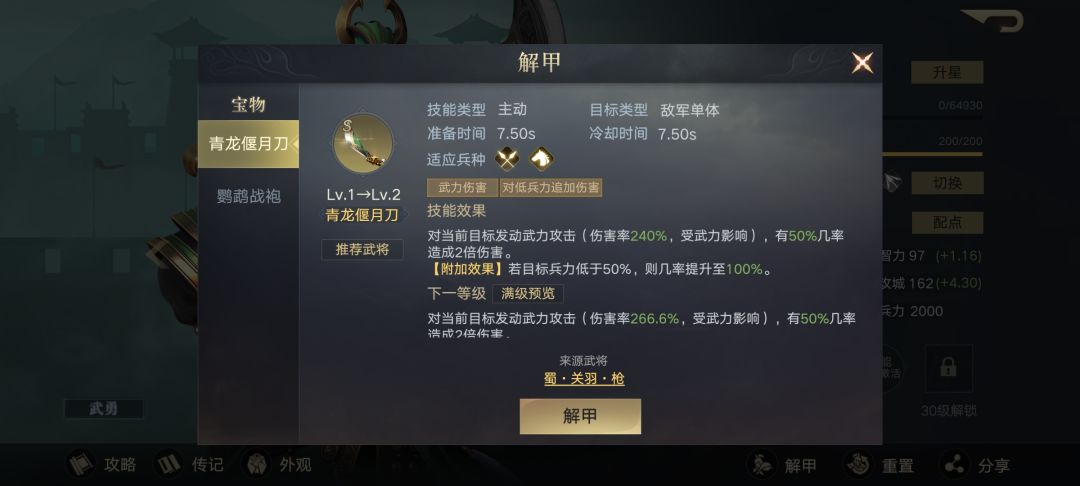 关羽的属性培养主走武力,优先提升其输出能力。在宝物的使用上,可以携带游侠双戟、青龙偃月刀这样发动武力攻击的宝物。