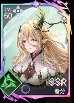春分:虽然很多人喜欢叫她春风,但实际上她叫春分。春分作为限定角色的强度是有目共睹的,把水队莉莉安花凛菲林三个人捆起来摞一块可能勉强能跟春分打个五五开,一身的BUFF,对全队输出面有大幅增强,对全队耐久面也有大幅增强,在面对群体攻击的BOSS时奶量相当喜人。别的队伍还不知道该带哪个SSR呢,风队这都开始竞争上岗了,春分的地位是「莲华上位」,而不是「敏尼上位」,暂时是无法替换掉敏尼的,敏尼的免疫盾和对敌人风属性防御降低的DEBUFF是春分所不具备的,而且敏尼的稳定奶相对来说也很重要(听说春分的叠加BUFF加攻和敏尼是不冲突的),所以现在风队长线阵容是莎斯分尼四人组,基本上可以AUTO硬刚目前所有无跨属CUT的副本,没有任何压力,风队整体强度现在吊打其他队伍几条街,别的队伍看着风队AUTO2T打副本馋得不行(特指弟属性)