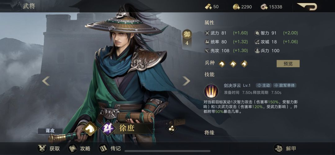 徐庶在游戏中属于群雄阵容,但是他在三国的前期属于蜀国,在游戏的S4赛季(国服还没到)中有蜀国版的徐庶,所以作者在此也介绍一下群雄的徐庶。徐庶是群雄四御骑兵型武将。其自身技能为剑决云浮,是一个主动技,对当前目标发动智力攻击300%和1次武力攻击240%,并且两个都附带50%的暴击几率。其输出是智力和武力都有的,所以可以看成一个540%的伤害率输出技能,是一个输出非常高的技能,性价比也是比较高的,如果没有其它主力输出武将的情况下可以用徐庶顶替也是可以的。