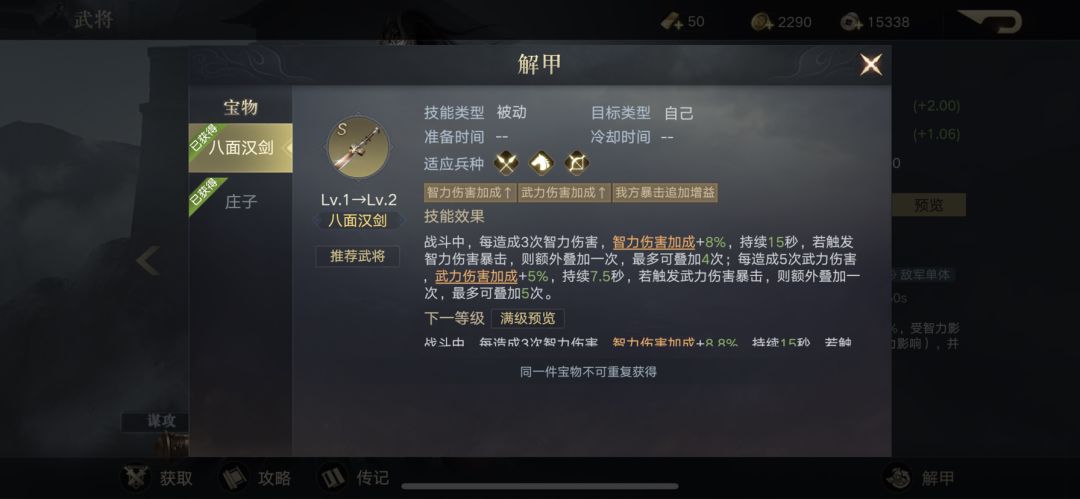 八面汉剑:是一个被动技能,战斗中,每造成3次智力伤害,智力伤害加成+8%-→16%,持续l5秒,若触发智力伤害暴击,则额外叠加一次,最多可叠加4次;每造成5次武力伤害,武力伤害加成+5%-→10%,持续7.5秒,若触发武力伤害暴击,则额外叠加一次,最多可叠加5次。这件宝物非常适合一些智力型输出武将使用,如周瑜,郭嘉(S2赛季),徐庶等武将佩戴。