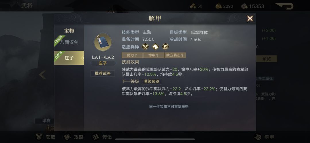 庄子:使武力最高的我军部队武动+20-→40,命中几率+20%- >40%;使智力最高的我军部队暴击几率+12.5%-→25%,均持续4.5秒。庄子是个非常不错的辅助宝物,可以让一些辅助型武将佩戴,如曹丕,荀攸,庞统都是可以的。