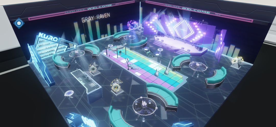 最终沙发和桌子用了两种方向的摆放,感觉还不错(有考虑过用咖啡厅的沙发和桌子放在吧台附近,但是这个主题的颜色又太亮了,有点突兀,最后还是改了个反向摆放)