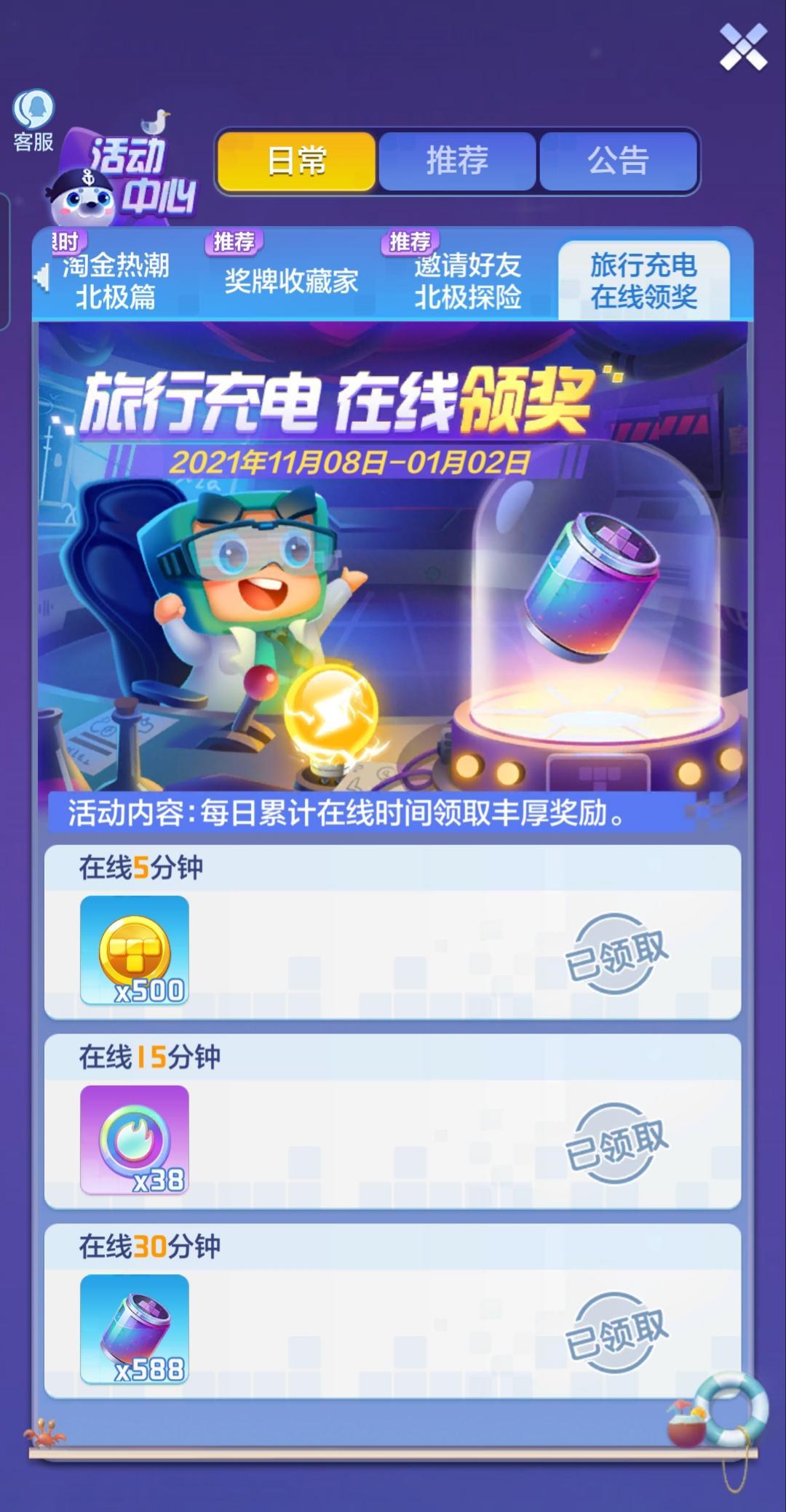 首先就是小环游每日充电活动!从2021年11月8日到2022年1月2日,每日累计在线时间达到5、15、30分钟即可领取金币、特趣思币和皮肤胶囊的丰厚奖励!