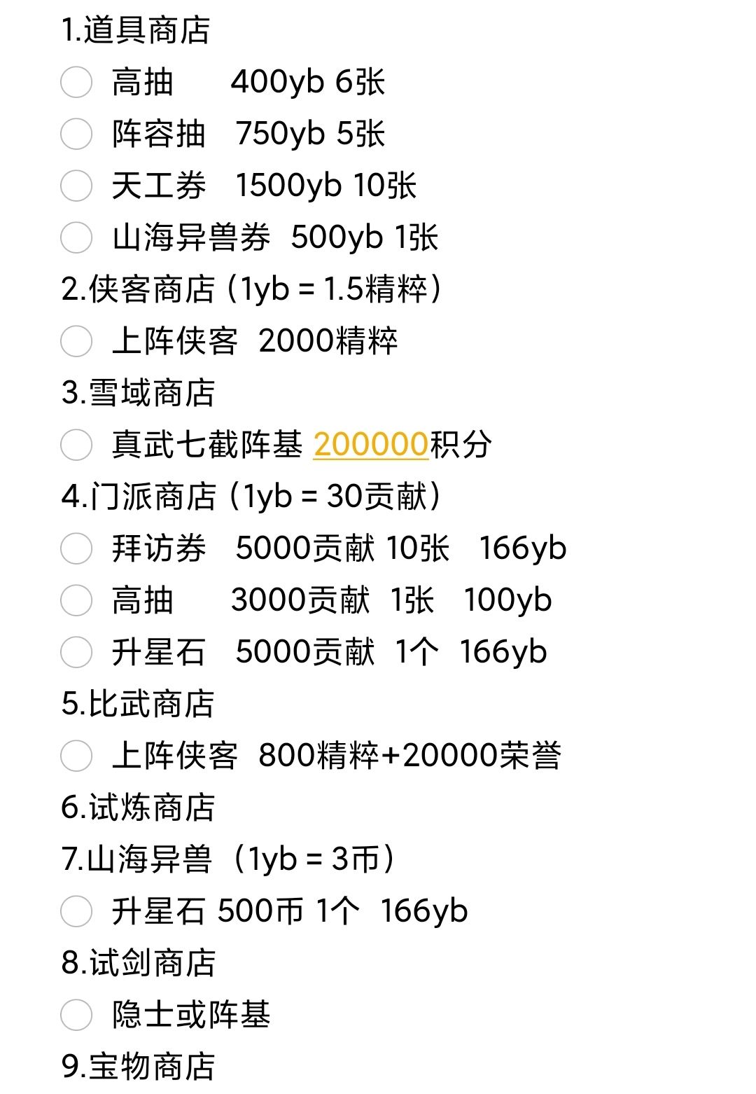 门派商店每天98yb可以得到3000贡献,按此比例换算可以得到门派商店各物品的价值,又根据升星石换算出山海异兽商店的价值,根据拜访券换算出侠客商店的价值。总结出图上值得买的一些物品,大家可以截图保存参照。