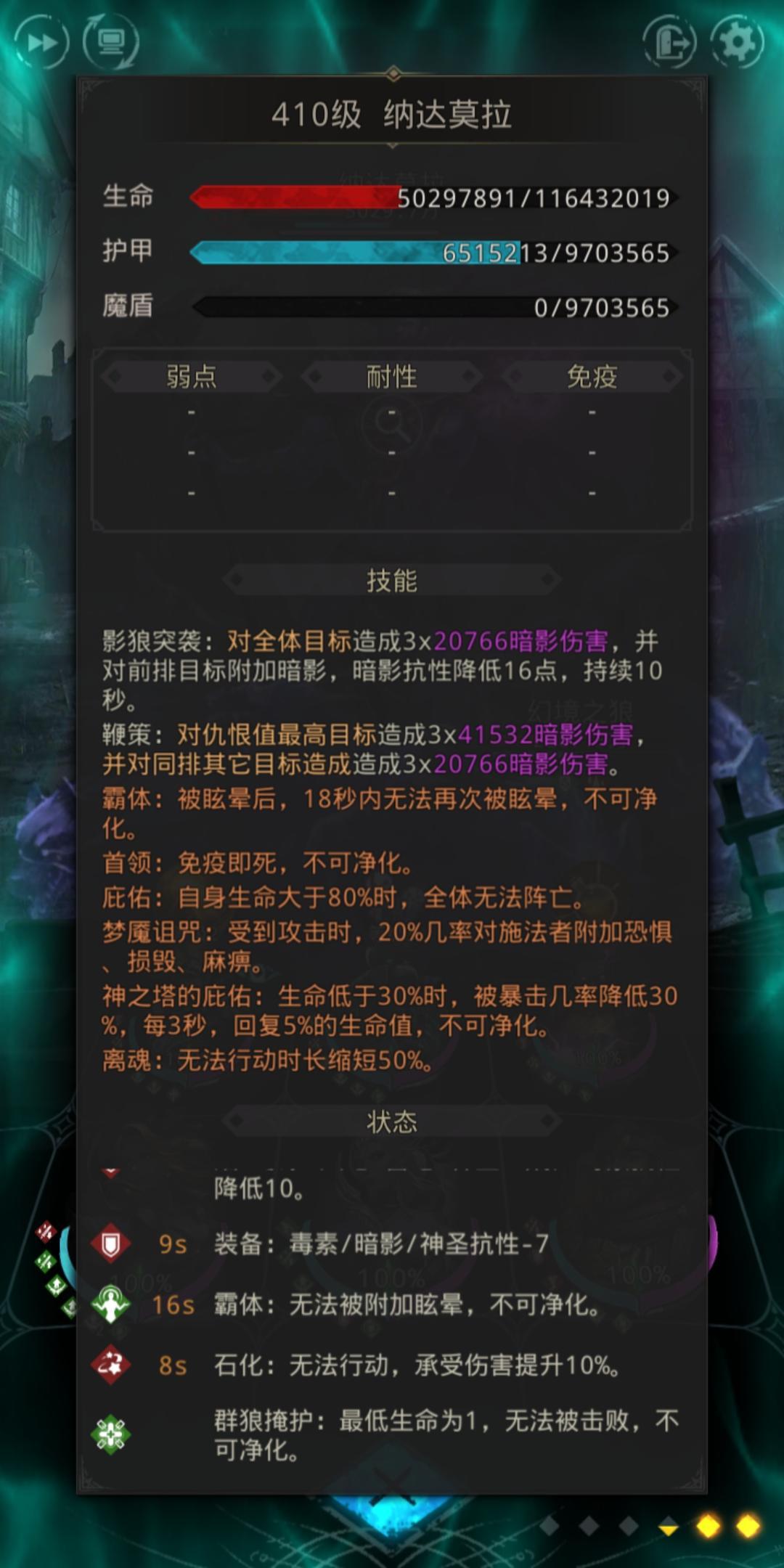 源世界后面的boss,基本都有控制时间减半的词条,很多人说群宝没用了,其实不然,只要我们把群宝负面洗到120%,我们依然可以石化8秒,我们拿源4boss狼王举例: