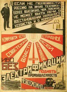 大家是否注意到雏菊女神像左面,倒置+镜面翻转的宣传海报?在圆心辐射出来的红色条纹上从左到右的单词:СТРАНЫ、ВСЕЙ、ЭЛЕКТРИФИКАЦИИ、ПЛЮС、ВЛАСТЬ、СОВЕТСКАЯ、КОММУНИЗМ ЕСТЬ。应该从右到左读,大意是:共产主义是苏维埃政权加上全国的电气化。下面的横排单词从上到下则是ЛИБО(?)、 БЕЗ、ЭЛЕКТРИФИКАЦИИ、 ПОДНЯТЬ、ПРОМЫШЛЕННОСТЬ。大意是:没有电气化就没有工业增长。这两句话出自列宁1920年9月20日在莫斯科的俄共(布)代表会议上的发言。海报正是那个高潮时期的产物。