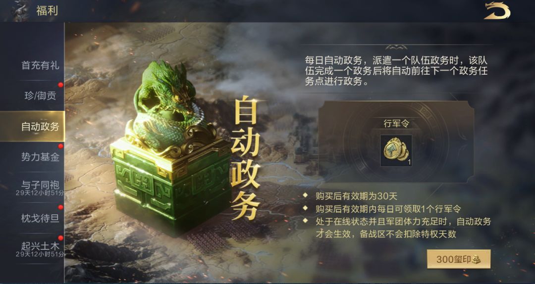 增加自动政务功能:玩家可消耗300玺印开启自动政务功能,开启后30天内每日可获得一个行军令,并且当玩家处于在线状态时派遣一支军团连续自动完成当日的政务