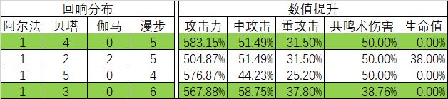 在确保中攻击和共鸣术伤害的前提下,贝塔和伽马的增减就是26%的攻击力和28%生命值的取舍,在考虑到角色死亡的情况下可以适当的用伽马替换贝塔,我个人比较欣赏2521的分布组合,能稍微保证一点生存能力,当然具体情况具体分析,能保证存活的情况下疯狂堆贝塔能提供大量伤害。一张“遗迹漫步”各项数值提升巨大,策划送了这么多钻,贫民玩家请去蹭一张回来。其他的回响刷多人困难本就行了,工坊也能制作,3周