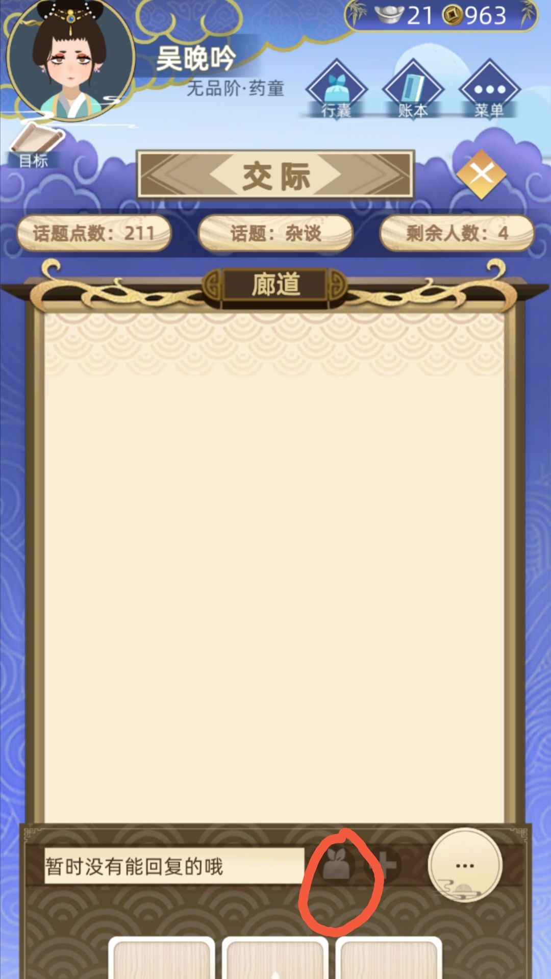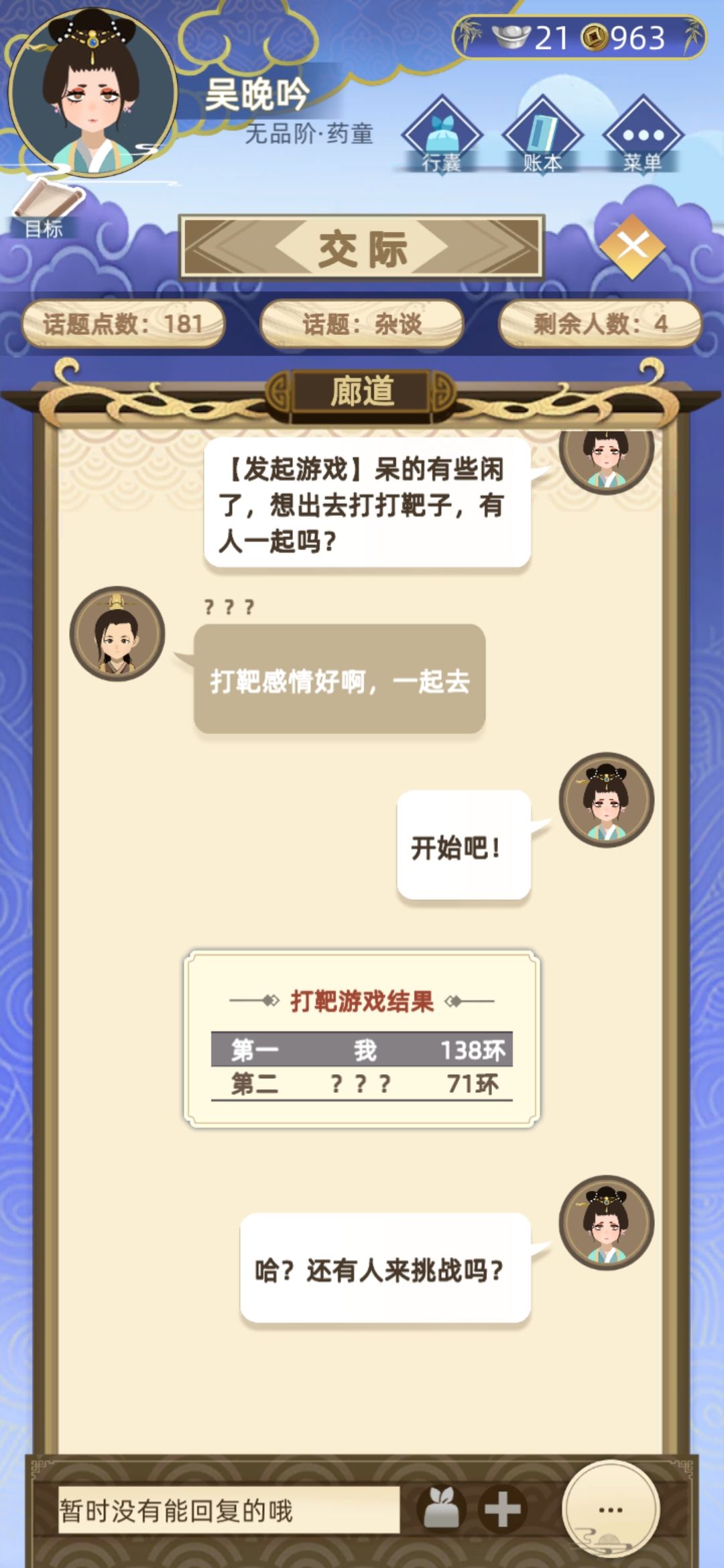 消耗25话题,但是赌大小不能赌钱,捉促织只有30秒,打靶也不能加体魄。所以能在这里刷猎物,促织。这就是为什么会友的功能很强大了。