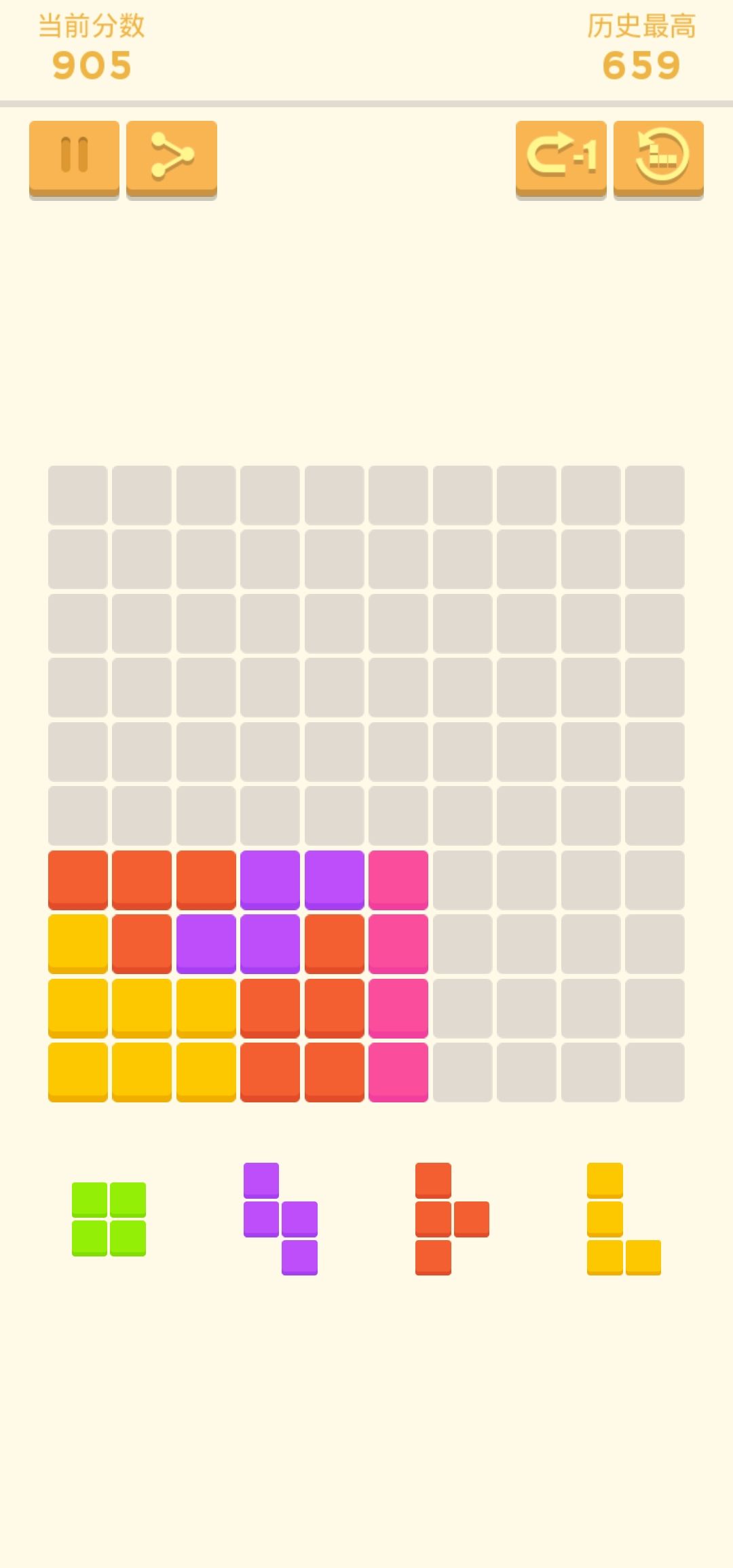 这游戏实际上有技巧的,只要玩的多,感觉甚至可以无限玩下去,只是脑力消耗太大了,后面就会失误连连,最后玩到1344也是太累了,就不玩了。但感觉你只要分数高,这游戏好像就有一种“保护机制”,给的方块就特别好。两次都快凉了他突然给的特别好,于是在几乎不可能的情况下抢救回来。技巧基本就是把方块弄到一堆去,然后我觉得最左边和最右边要尽量高一点,绝对不能放在最后去填,要不然很难等到需要的那块,玩法的话就普通的从最底下开始放。