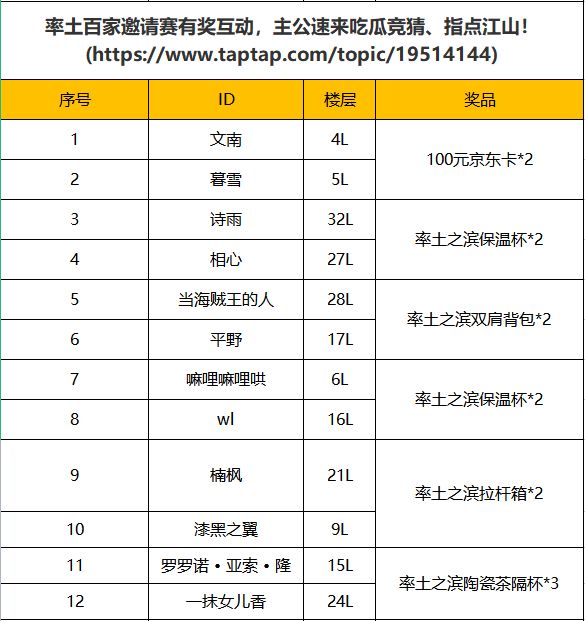 活动顺利结束,感谢各位大人的参与,让我们恭喜以下幸运玩家获得奖励!