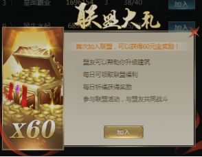 联盟是游戏真正开始的地方,联盟开放需要君主13级,且开放外使院,首次加入联盟还有60元宝奖励和联盟迁城令。