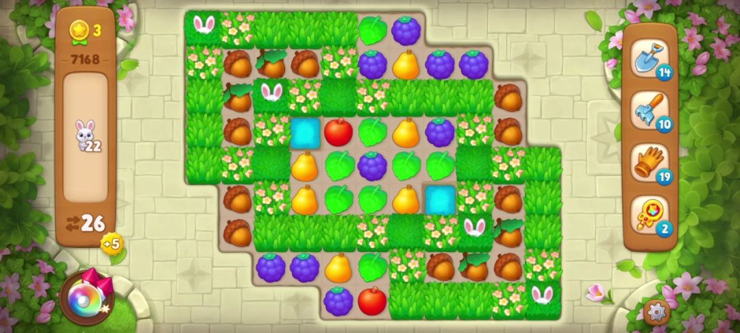 小兔子:在周围匹配即可消除,没有匹配会随机转移到空余的草地里,一般当有深色草地时会躲在深色草地里。
