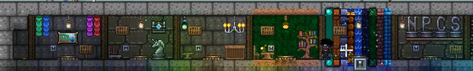 这里粗略的说吧从左到右的传送点所对应房间内的重要物品大类依次为,怪物旗帜画,电路矿车物品,制造台类,家具,各类金属锭与方块,npc居住地。进去后看着展示台的物品就能轻易定位了。
