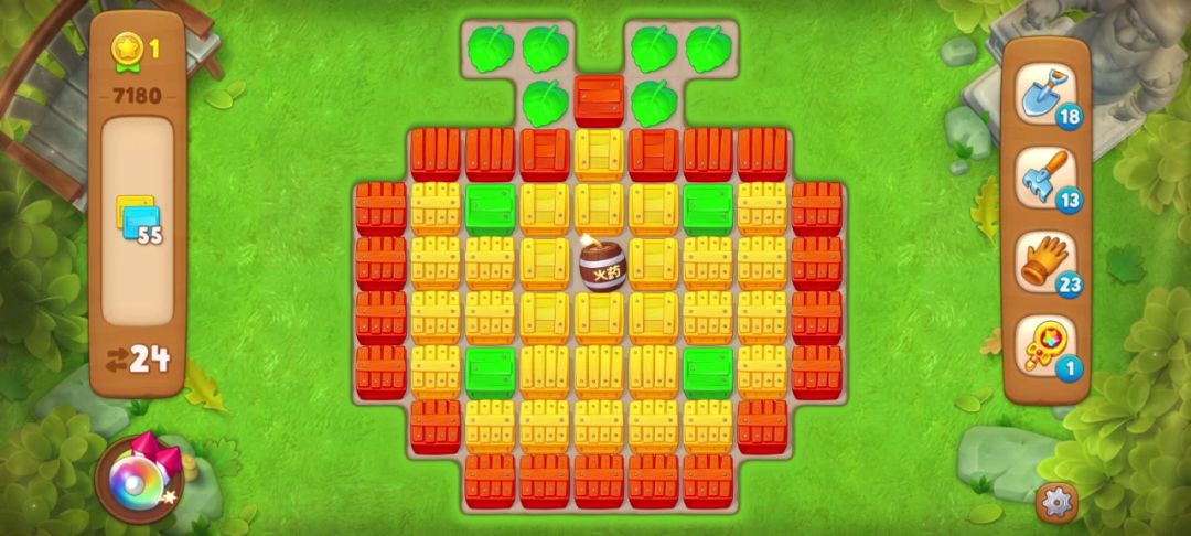 ①观察开局:这一关比较直接,不用思考,把火/药点燃就好了!然后会出现下图,有四个雷/管同样是点燃它们。这些彩色箱子每个都需要多次匹配才能清除,所以这一关通关的最好方法是凑双彩!