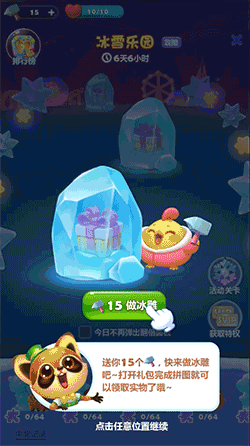 每座冰雕都对应了一种消消乐周边奖励,当完成冰雕时不仅可以开启礼盒赢奖励,还能获得该周边的拼图碎片,集齐碎片完成拼图就能获得此周边!