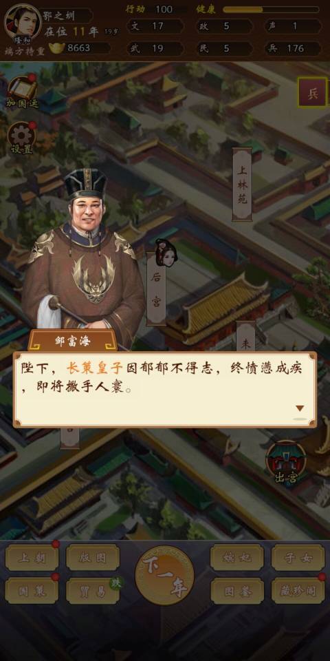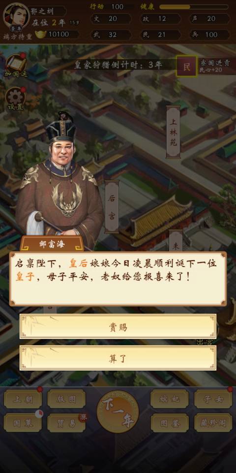 通过选秀、奇遇等事件,玩家可以在后宫中招纳妃子,并逐步提升与后妃的好感。临幸后妃,她们将会有几率诞下皇子与皇女。