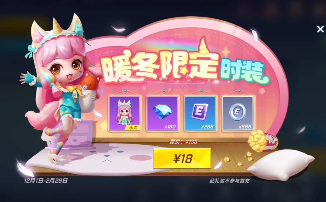 2021年12月1日至2022年2月28日,玖儿来陪你过冬啦~只需18元就可以开启冬季礼包!解锁小狐狸·彩虹梦境套装以及钻石、点券和白金币!