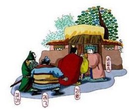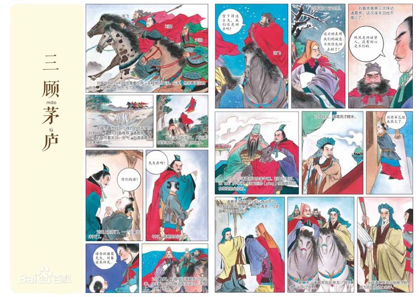汉末,黄巾事起,天下大乱,曹操坐据朝廷,孙权拥兵东吴。一次,刘备在中原吃了败仗,只得逃往荆州,依附刘表。为了能够复兴汉室,夺取天下,刘备到处招纳人才。徐庶和司马徽见他一心爱才,就向他举荐一个人,此人就是人称“卧龙”的诸葛亮。诸葛亮不仅很有学识,又有才能,于是刘备就和关羽、张飞带着礼物到隆中卧龙岗去请诸葛亮出山辅佐他。