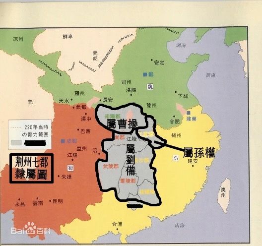 赤壁之战后,兵家必争的荆州七郡被刘备、曹操、孙权三家瓜分,曹操占据荆州北部最大的南阳郡和长江以北的江夏郡,孙权得到长江以南的江夏郡和大部分南郡,刘备得到长江以南的南郡、以及荆州南部四个郡(长沙、零陵、桂阳、武陵)。