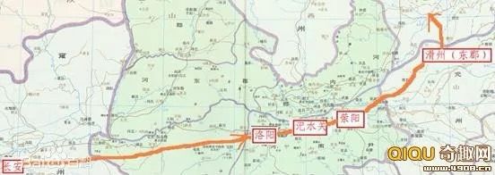 关公从河南省中部的许昌出发,要前往河北省寻找刘备,直接往北是最近的;考虑到主要渡口在东郡(滑州),那么出门后往北略微偏东一点点,或者绕一些小弯路也正常。然而按照前面对地图的分析,忽略多半是杜撰的东岭关,则关公他老人家从许昌出来后的大致路线是这样的:首先傻乎乎朝着西北方向猛跑,一直跑了数百里,经过中岳嵩山,到了当时已经近乎废墟的洛阳。在洛阳,或许关二哥看见滔滔黄河,猛然醒悟到自己走错了方向,这才改行向东,一路经过汜水关、荥阳,到达东郡渡河。