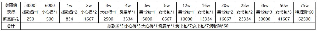 本次活动可以说是文明学校的升级版。玩家通过送出鲜花,获得相应的美丽值(每送出一朵鲜花将获得12点美丽值),根据玩家获得的美丽值得到相对应的奖励。小十已经将奖励和所需美丽值列出来啦,各位玩家可以自行观看。活动持续三天,根据最终玩家以及玩家所在校盟排名获得奖励。
