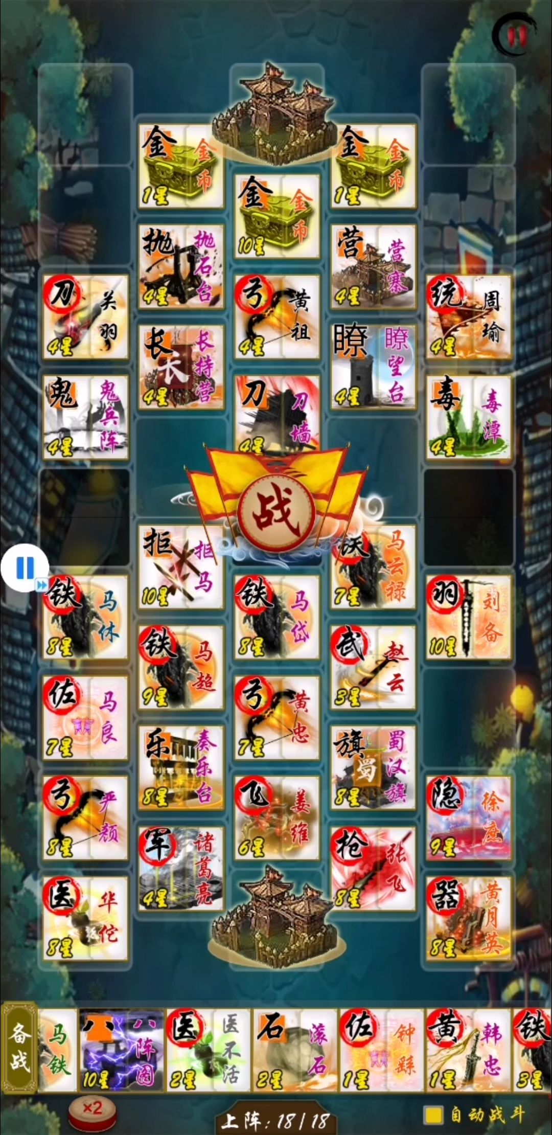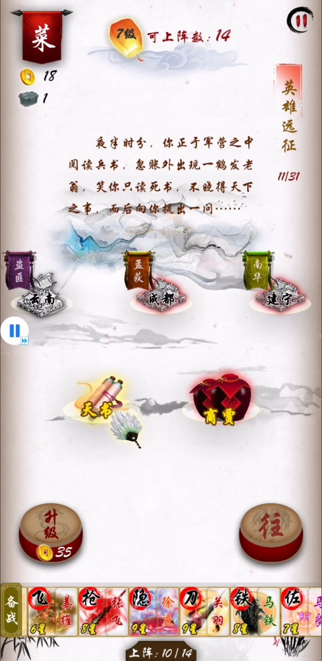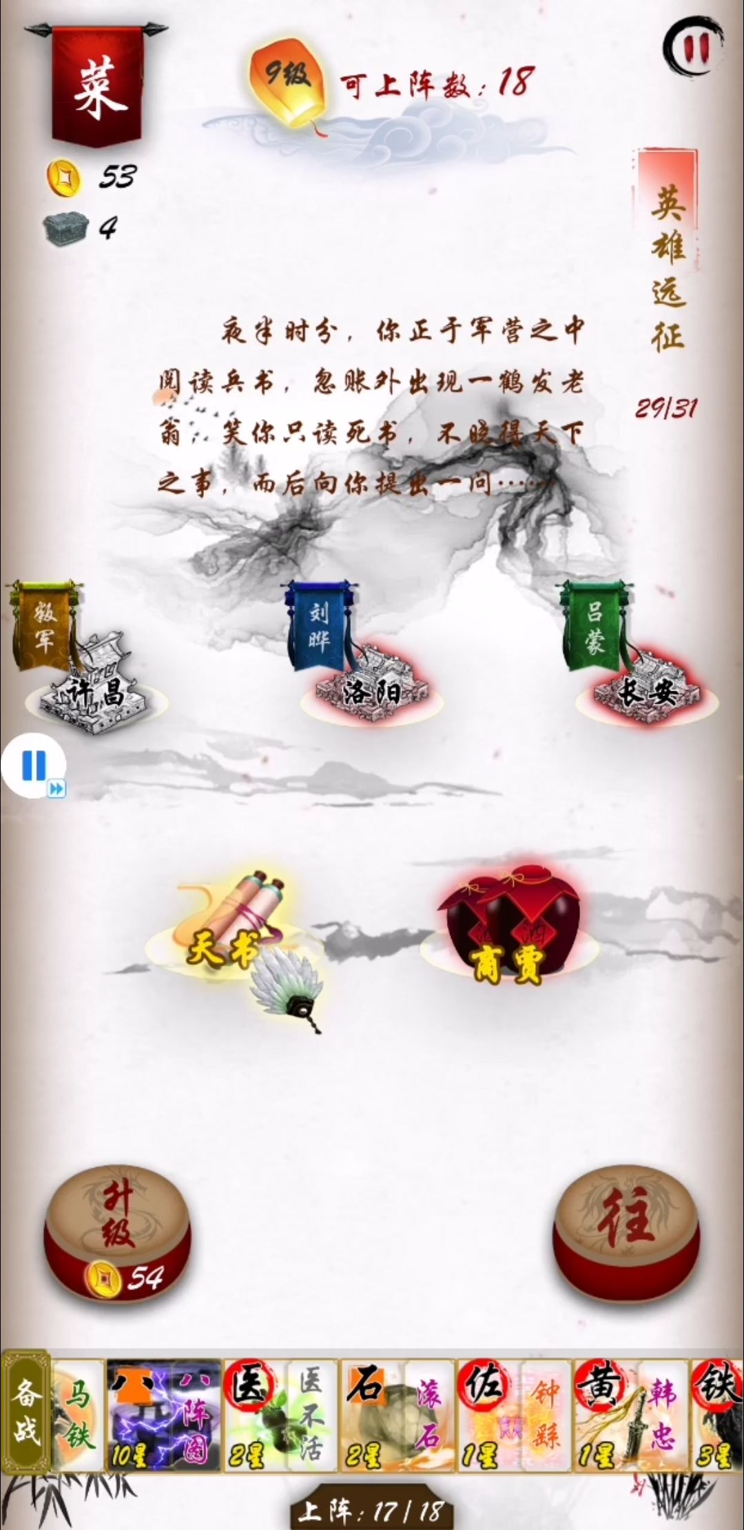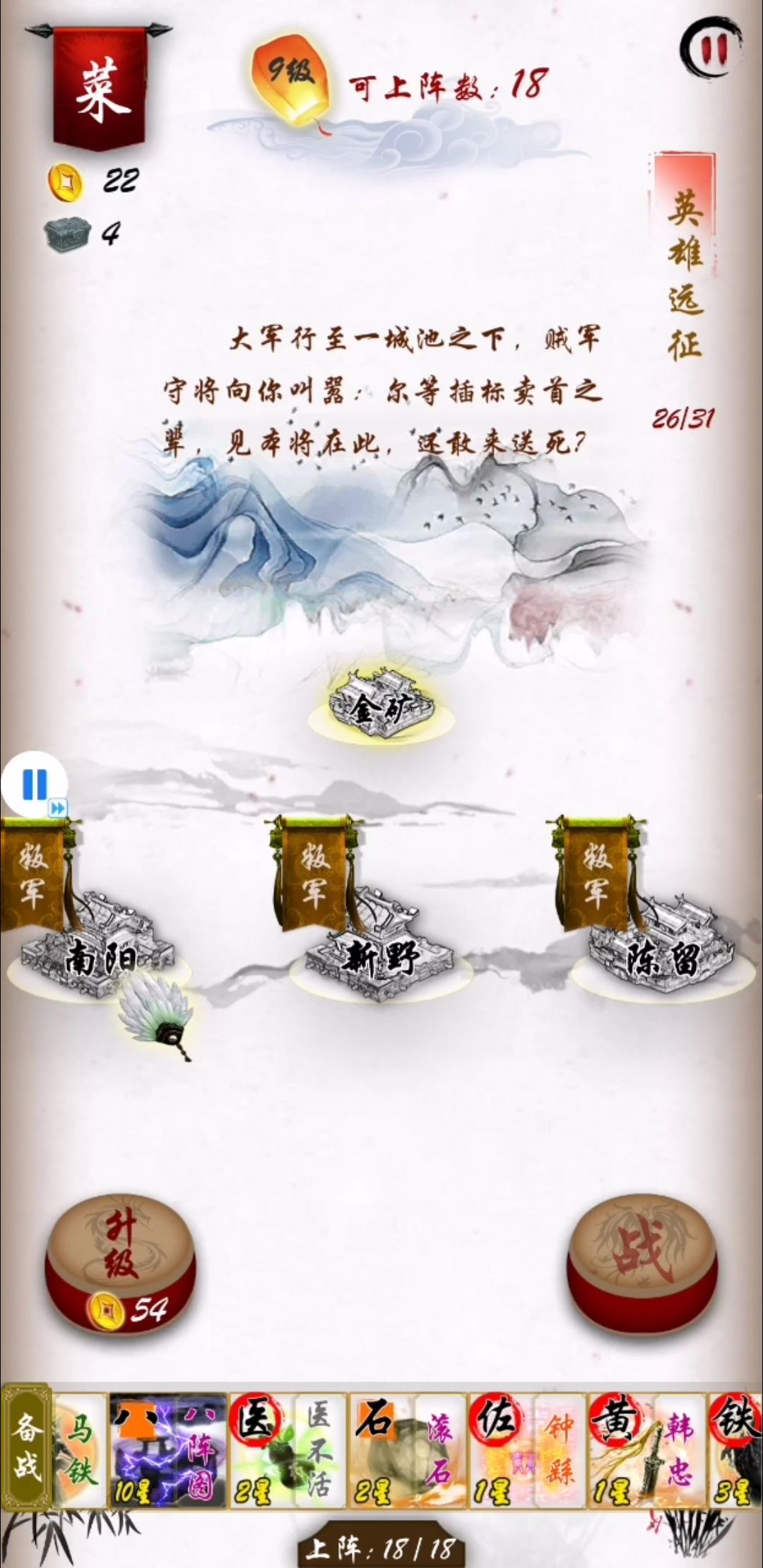 18关,再次抉择,张角和吕蒙,这里我选的是吕蒙,相比黄巾来说,还是吕蒙更简单点,最主要是我的阵型基本已经成了,不担心被破坏阵型。