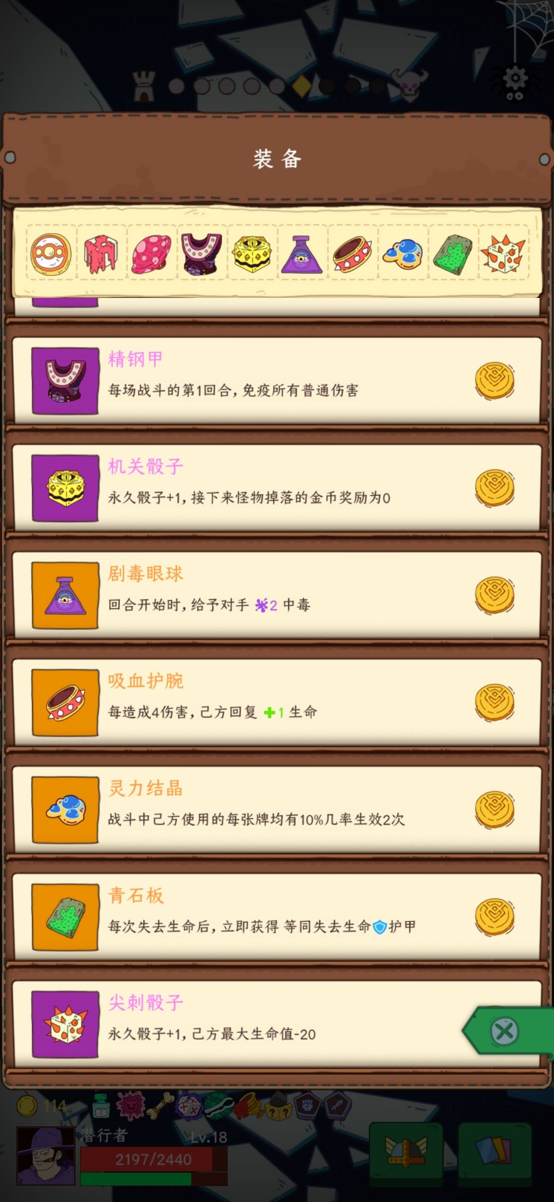 1. 无限回合毒爆流的卡牌核心就是凋零,禁令,和时空之力,然后装备必备就是剧毒眼球(回合开始时,给予对方2中毒)和神奇腰带(每使用一张牌后,有20%的几率生成一张起始出站牌),其他的装备以免疫伤害,和增加骰子数量为主。